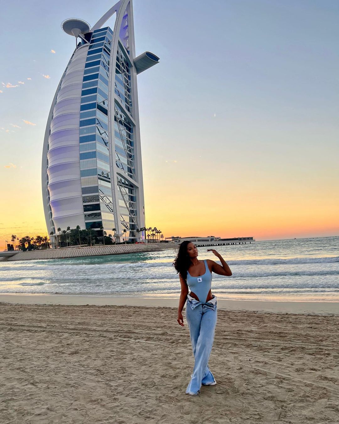 The make-up entrepreneur snapped a picture dressed in a baby blue costume and unzipped oversized jeans and look oh-so-stylish in front of the Burj Khalifa skyscraper.